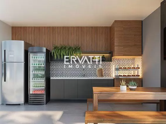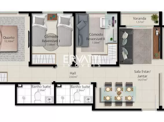 Apartamento de 3 quartos com cozinha no estilo americano, permitindo integração entre os ambientes da seguinte forma: